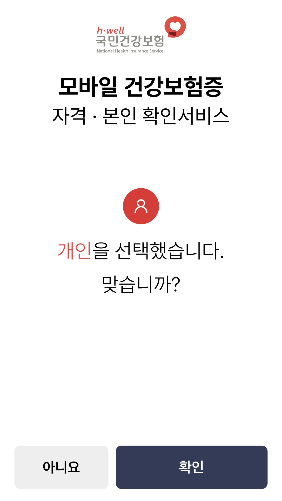 2. "개인입니까?" 선택 후 "확인" 누릅니다.