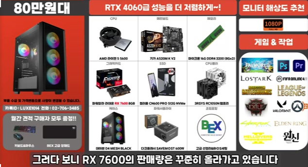 RX 6600과 RX 7600의 가격 차는 약 6만 원 정도이며, 성능 대비 가성비가 좋아 RX 7600의 판매량이 꾸준히 증가하고 있습니다.