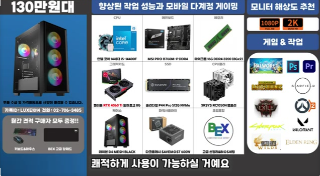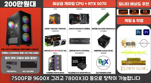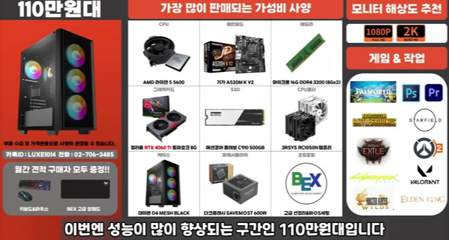 라데온 RX7900XT 또는 RTX 4070 Ti 구성. 고사양 스팀 게임 풀옵션도 가능한 수준이며, 메모리 32GB 또는 SSD 1TB로 구성하면 더욱 좋습니다.