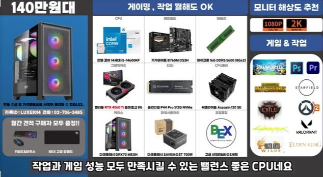i5 12400F + RTX 4060 Ti가 장착된 구성으로, 가장 많이 판매되는 조합입니다. 고사양 게임을 즐기시는 분들에게 적합하고, 5060 Ti가 이 자리를 대체해야 하지만 아직 8GB 모델은 출시가 부족한 상태입니다.